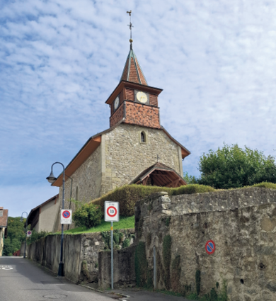Un peu plus loin, le Château d’En Haut témoigne, lui aussi, du passé rural de la commune. Il est encore au cœur d’une activité agricole dynamique, qui façonne le paysage et maintient le lien entre tradition et durabilité. Sur votre chemin, vous passerez devant le collège, la fontaine emblématique, l’ancienne maison de commune, puis découvrirez le temple de Mex, à l’esthétique sobre mais raffinée, orné de vitraux et de fresques du peintre Louis Rivier.