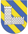 D’azur à trois bandes d’or, à la tour d’argent senestrée d’un mur du même, ces deux pièces crénelées, maçonnées et brochantes.