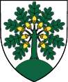 D’argent au chêne de sinople à neuf feuilles nonalobées, englanté de neuf pièces d’or et mouvant d’un mont du second