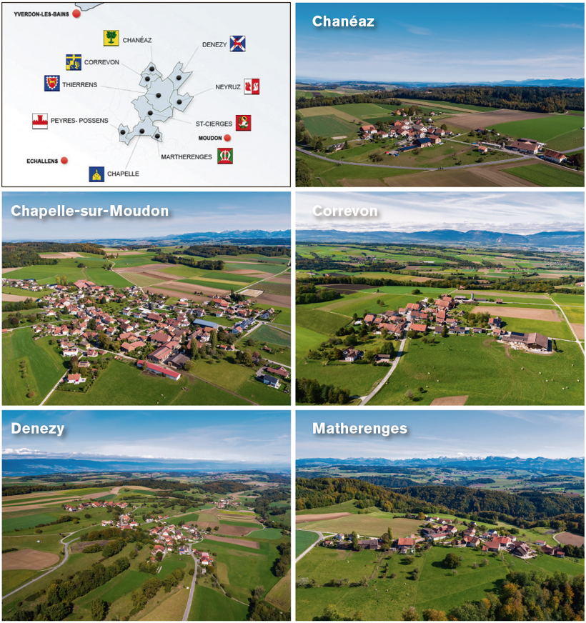 Chanéaz, Chapelle-sur-Moudon, Correvon, Denezy, Martherenges, Neyruz-sur-Moudon, Peyres-Possens, St-Cierges, Thierrens