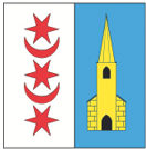 Parti au 1 d’argent à trois étoiles à six rails de gueules, rangées en pal et séparées de deux croissants du même; au 2 d’azur au moutier d’or, ouvert et maçonné de sable.