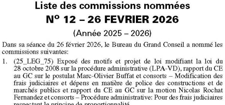 Au mois de juin 2026, le Grand Conseil vaudois procédera à l’élection complémentaire de 2 assesseur-e-s à la Cour de droit administratif et public (CDAP), conformément aux articles 155 et suivants de la loi sur le Grand Conseil du 8 mai 2007 (LGC) et à la loi d’organisation judiciaire vaudoise du 12 décembre 1979 (LOJV). Ces assesseur-e-s seront élu-e-s pour la législature 2025-2029, et, ce, jusqu’au 31 décembre 2029.