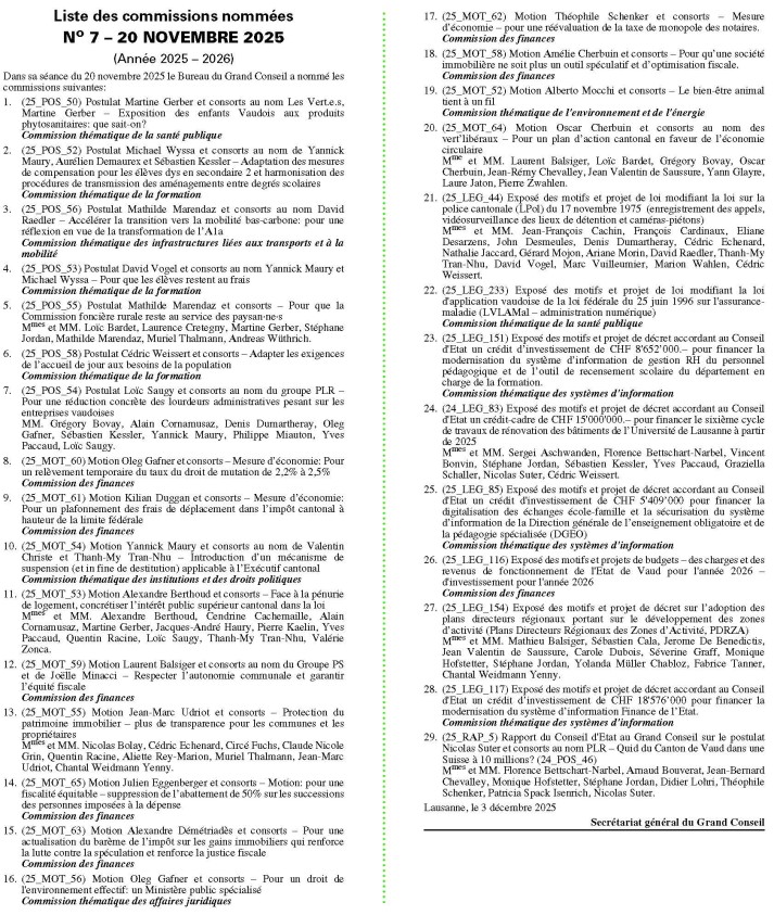 Au mois de juin 2026, le Grand Conseil vaudois procédera à l’élection complémentaire de 2 juges au Tribunal cantonal à 80%, conformément aux articles 155 et suivants de la loi sur le Grand Conseil du 8 mai 2007 (LGC) et à la loi d’organisation judiciaire du 12 décembre 1979 (LOJV). Ces 2 juges seront élu-e-s pour la législature 2025-2029, et ce, jusqu’au 31 décembre 2029. Selon les indications fournies par le Tribunal cantonal, il est recherché en priorité des candidat-e-s avec des connaissances approfondies en droit des assurances sociales.09.01.2026 / FAO n° 3