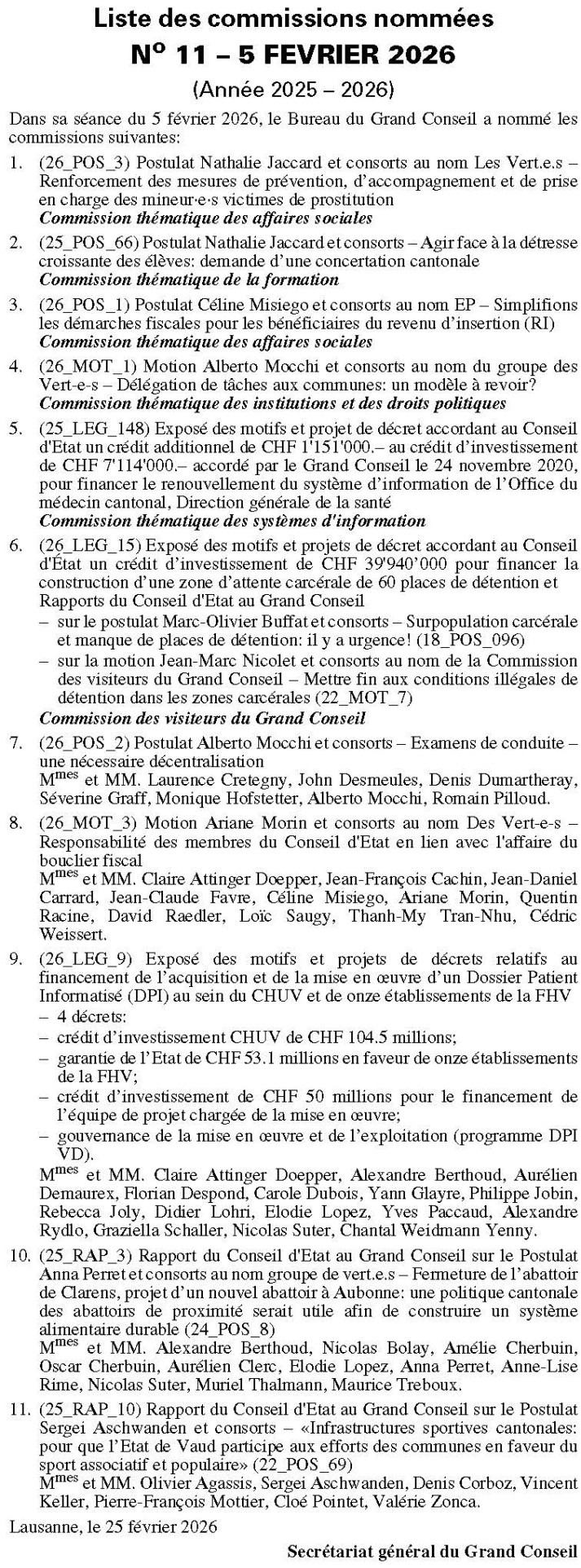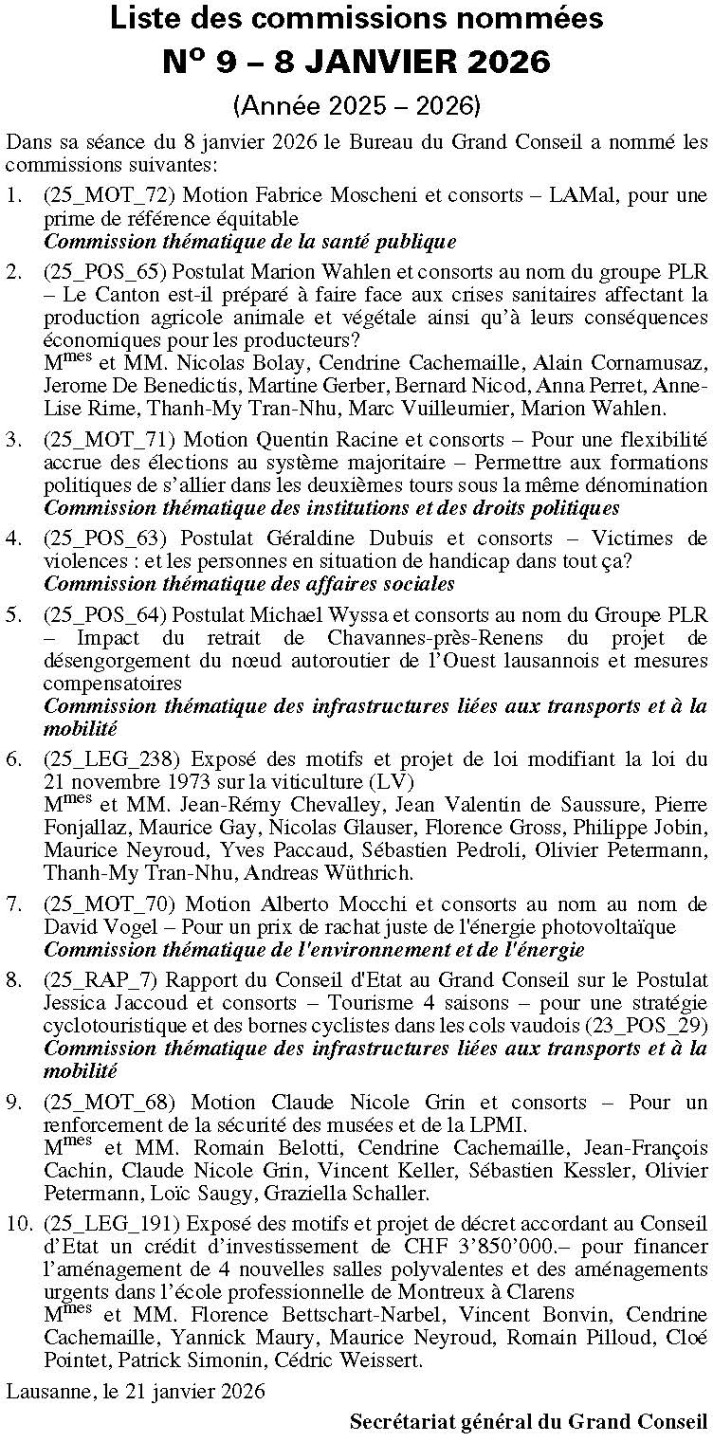 Au mois de juin 2026, le Grand Conseil vaudois procédera à l’élection complémentaire de 2 assesseur-e-s à la Cour des assurances sociales (CASSO), conformément aux articles 155 et suivants de la loi sur le Grand Conseil du 8 mai 2007 (LGC) et à la loi d’organisation judiciaire vaudoise du 12 décembre 1979 (LOJV). Ces assesseur-e-s seront élu-e-s pour la législature 2025-2029, et, ce, jusqu’au 31 décembre 2029.