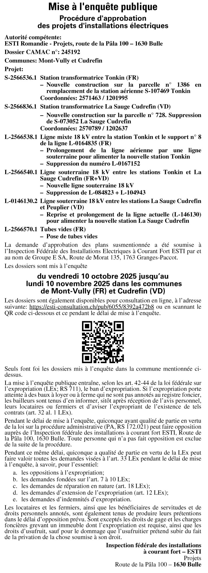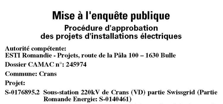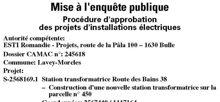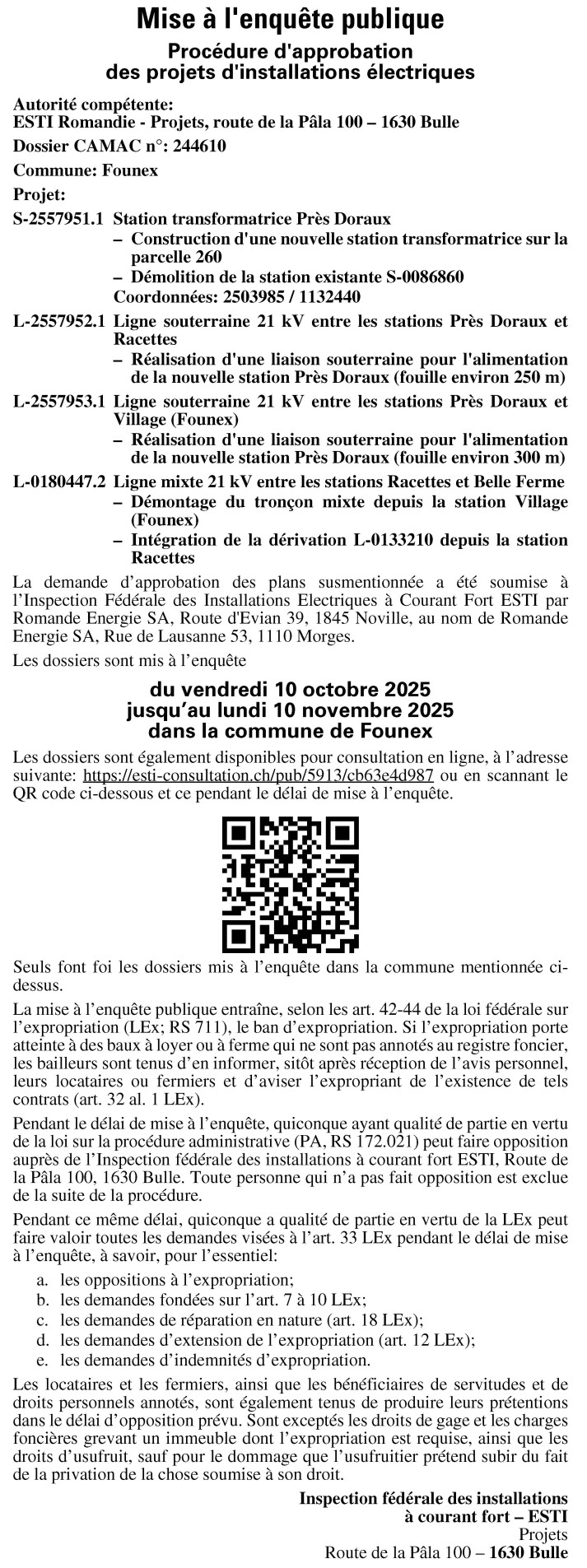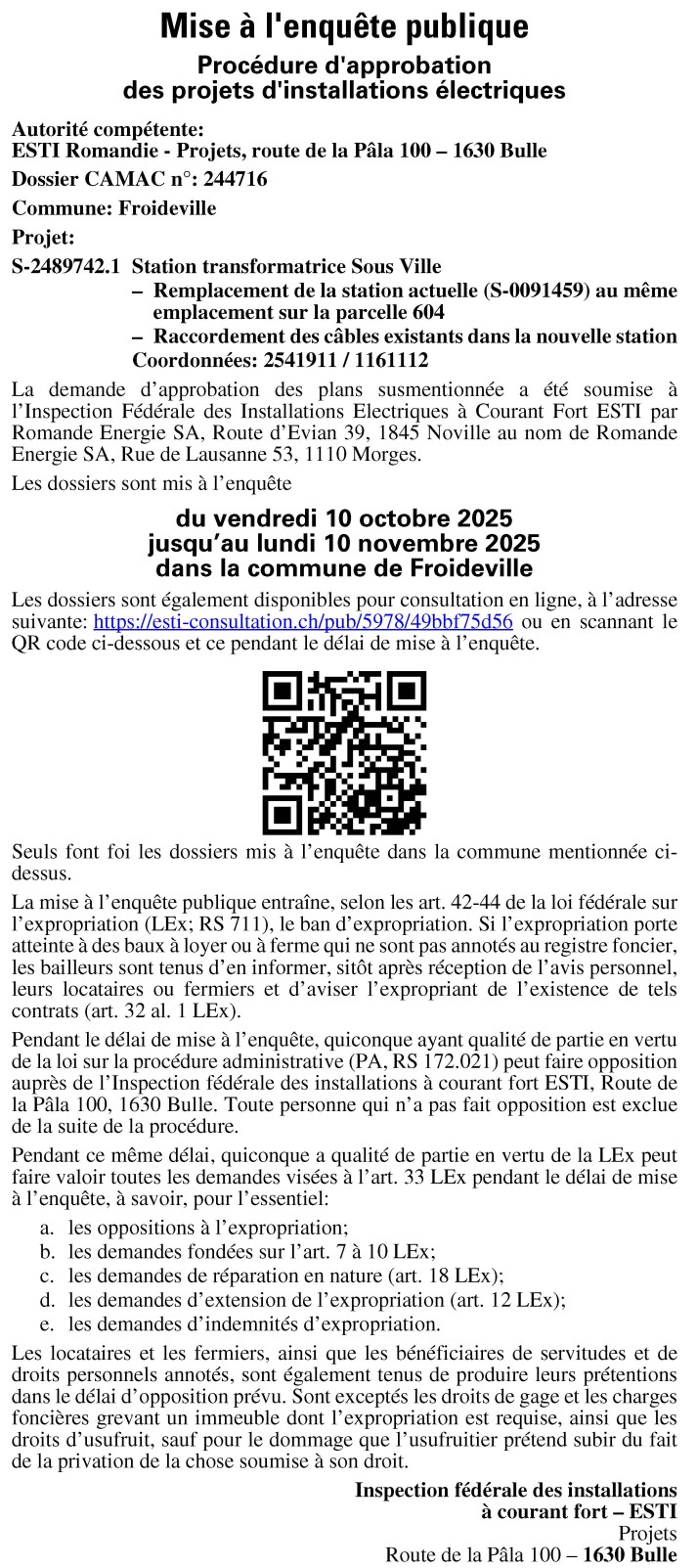 La décision finale relative à l’étude de l’impact sur l’environnement et le dossier d’enquête pourront être consultés à la Maison de l’Environnement (Av. de Valmont 30b, 1014 Lausanne) et au greffe municipal de la Commune de Valbroye, du 21 octobre au 21 novembre 2025.