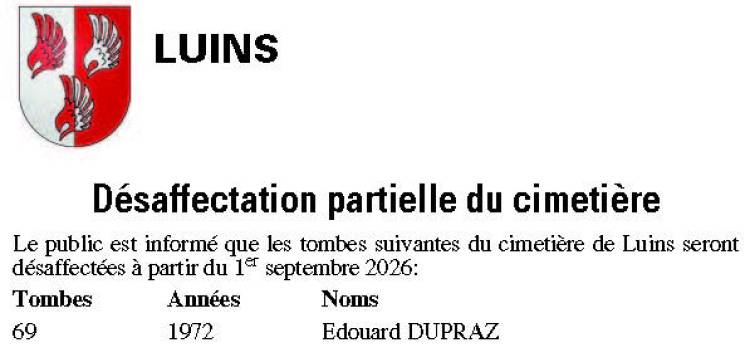 Conformément aux dispositions du règlement sur les décès, les sépultures et les pompes funèbres (RDSPF) du 12 septembre 2012 et du règlement communal des sépultures et du cimetière du 8 août 2017, le public est informé que les tombes suivantes seront désaffectées à partir du mois d'avril 2026.