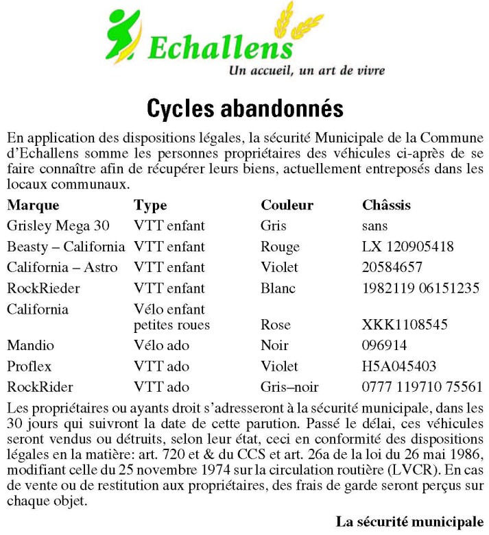 En application des dispositions légales, la Commune de Moudon somme les détenteurs des cycles désignés ci-dessous de récupérer leurs véhicules, actuellement déposés à la fourrière municipale. Ces propriétaires (ou ayants droit) s’adresseront à la réception du service de sécurité publique, pl. de l’Hôtel-de-Ville 1, 1510 Moudon, dans les 30 jours qui suivront la date de cette parution.
