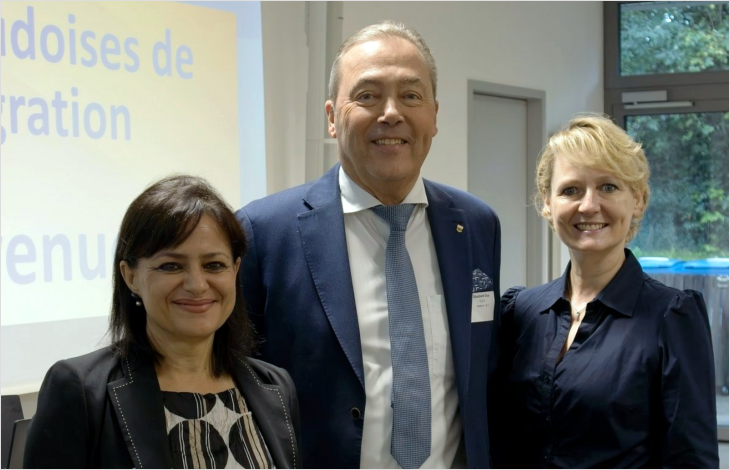 De gauche à droite, Amina Benkais-Benbrahim, déléguée à l’intégration des étrangers, Guy Gaudard, président de la Chambre cantonale consultative des immigrés (CCCI), Isabelle Moret, cheffe du Département de l’économie, de l’innovation, de l’emploi et du patrimoine (DEIEP).