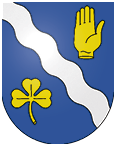 D’azur à la bande ondée d’argent, accompagnée en chef d’une main appaumée d’or et en pointe d’un trèfle du même.