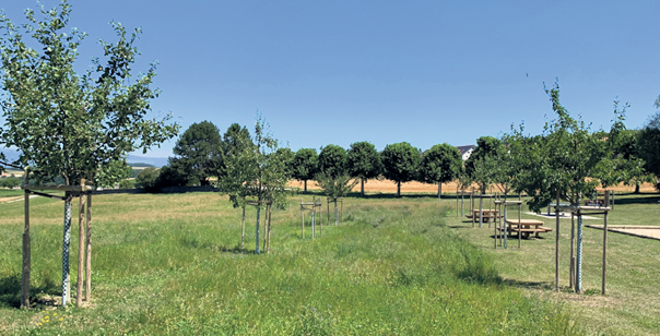 Verger communal planté en 2017 avec l’aide de la population qui a pu s’initier au traitement et à la taille des arbres fruitiers.