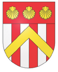 Palé d’argent et de gueules au chevron d’or brochant, au chef de gueules chargé de trois coquilles d’or.