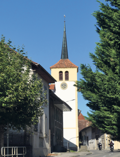La grange-écurie voisine du garage Cottier est l’un des nombreux bâtiments classés de la commune. Reconstruite en 1815, son architecture est soignée: chaines d’angle en molasse ornée de chapiteaux, bandeau séparant les niveaux, et un petit soleil gravé sur l’une des façades.