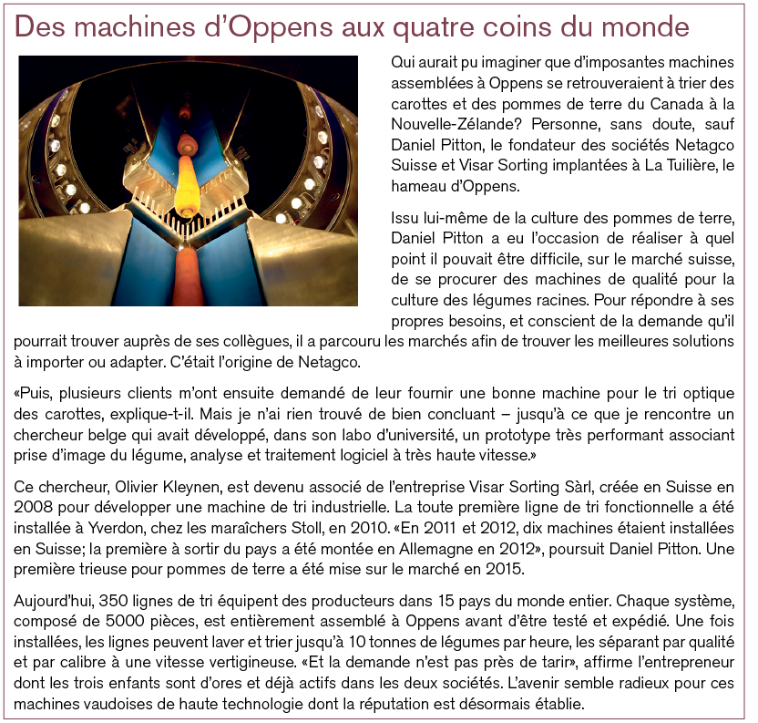 De l’autre côté du Sauteru, dans le hameau de La Tuilière, se sont développées les sociétés sœurs Netagco Sàrl et Visar Sorting Sàrl. Puisant leurs origines dans la culture des pommes de terre, ces entreprises de haute technologie agricole emploient aujourd’hui 40 employés (voir encadré).