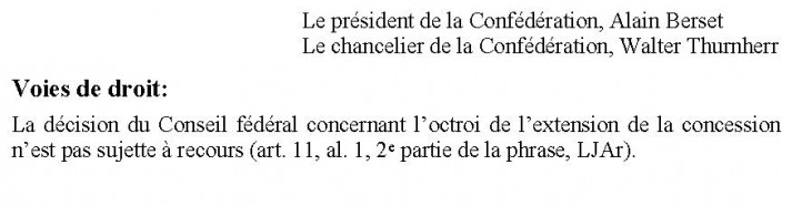 Quiconque a qualité de partie en vertu de la loi fédérale sur la procédure administrative (PA; RS 172.021) peut, conformément à l’art. 27 d al. 1 LRN, faire opposition pendant le délai de mise à l'enquête publique, par écrit avec demande et motivation, contre le projet définitif auprès du Département fédéral de l’environnement, des transports, de l’énergie et de la communication (DETEC), Kochergasse 10, 3003 Berne . Toute personne qui n’a pas fait opposition est exclue de la suite de la procédure. Les communes font valoir leurs intérêts par voie d’opposition.