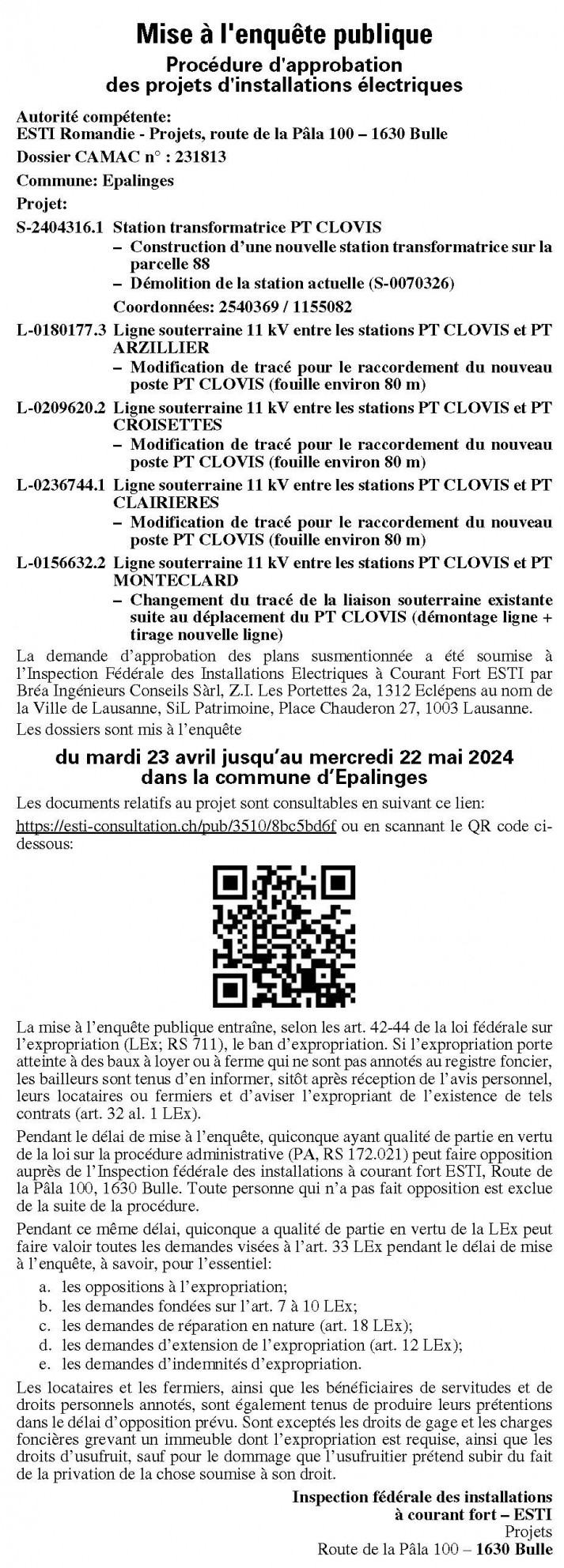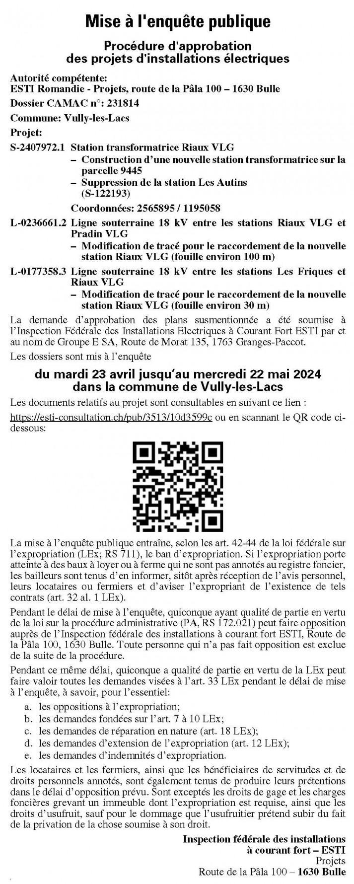 Mise à l'enquête : Les plans peuvent être consultés à l’adresse suivante: