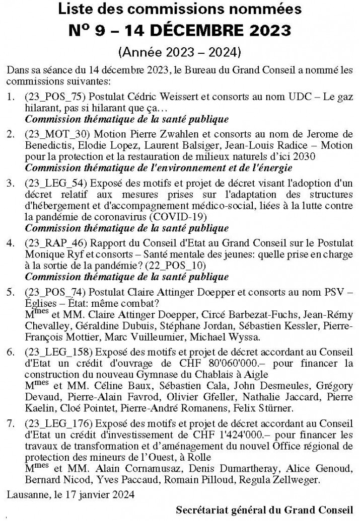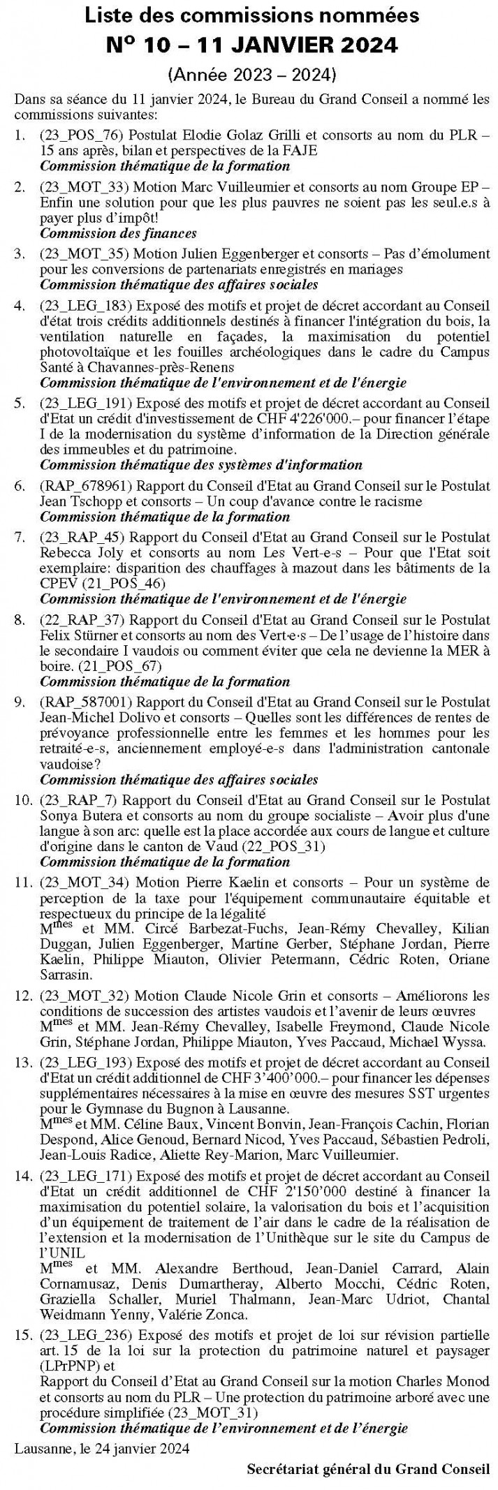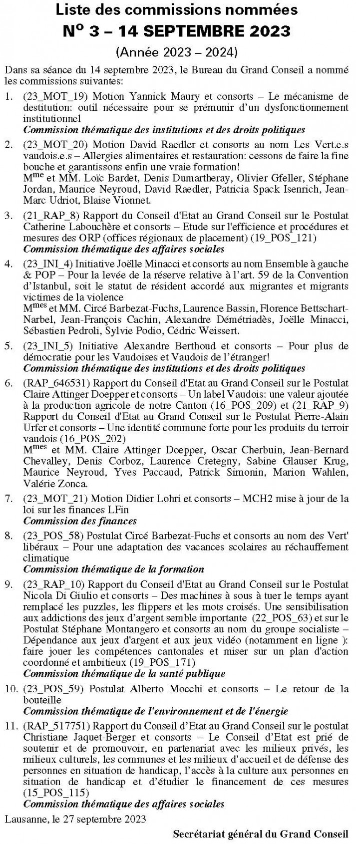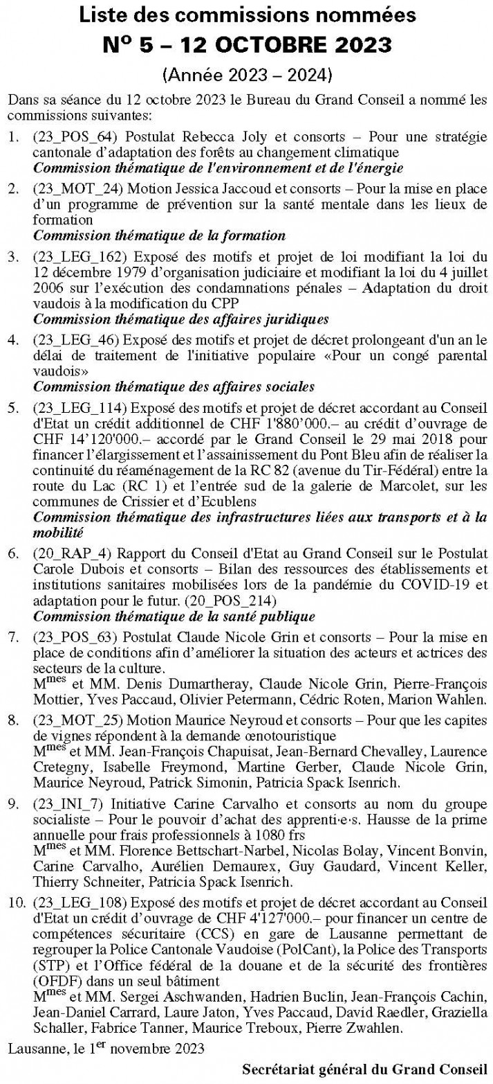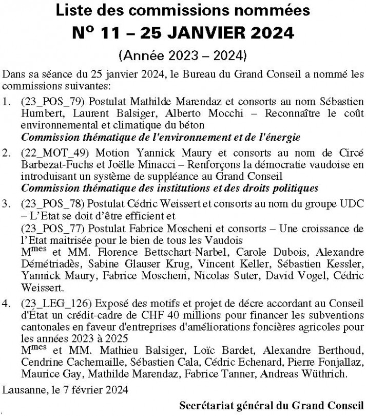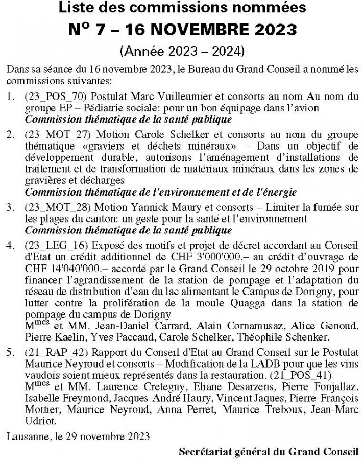 Dans sa séance du 2 novembre 2023, le Bureau du Grand Conseil a nommé les commissions suivantes: