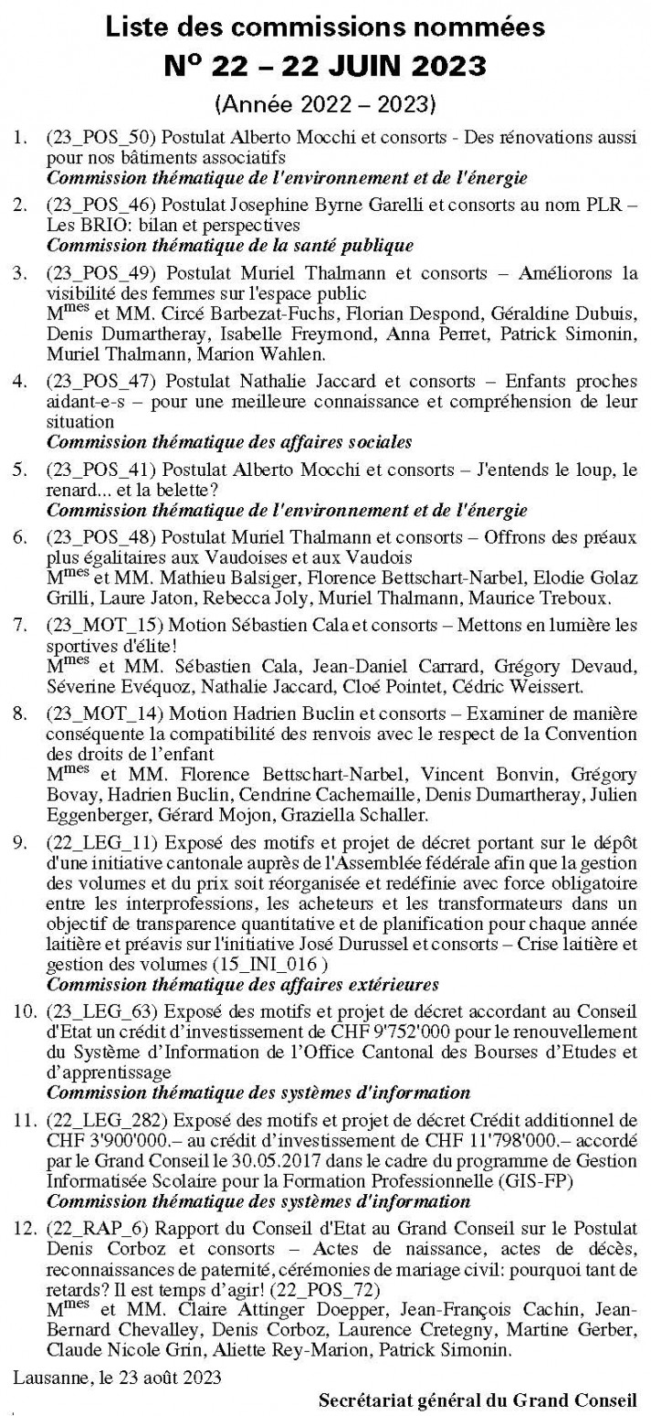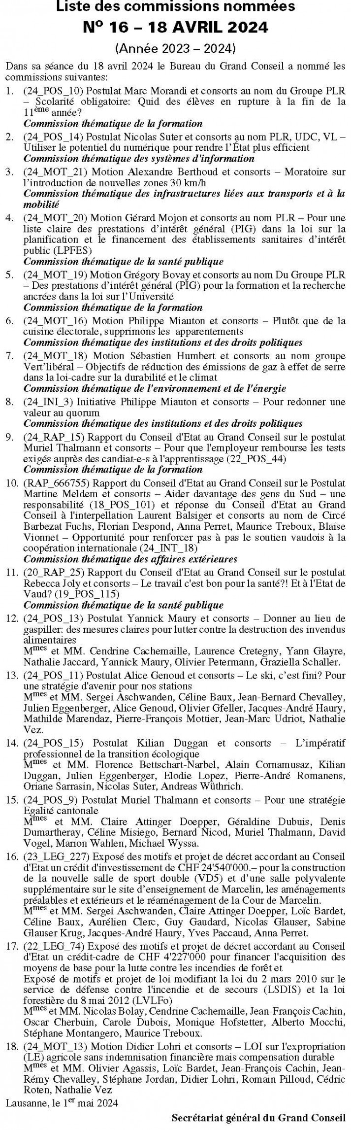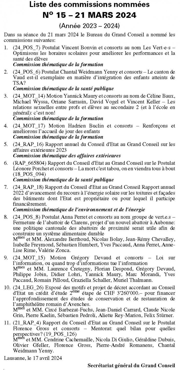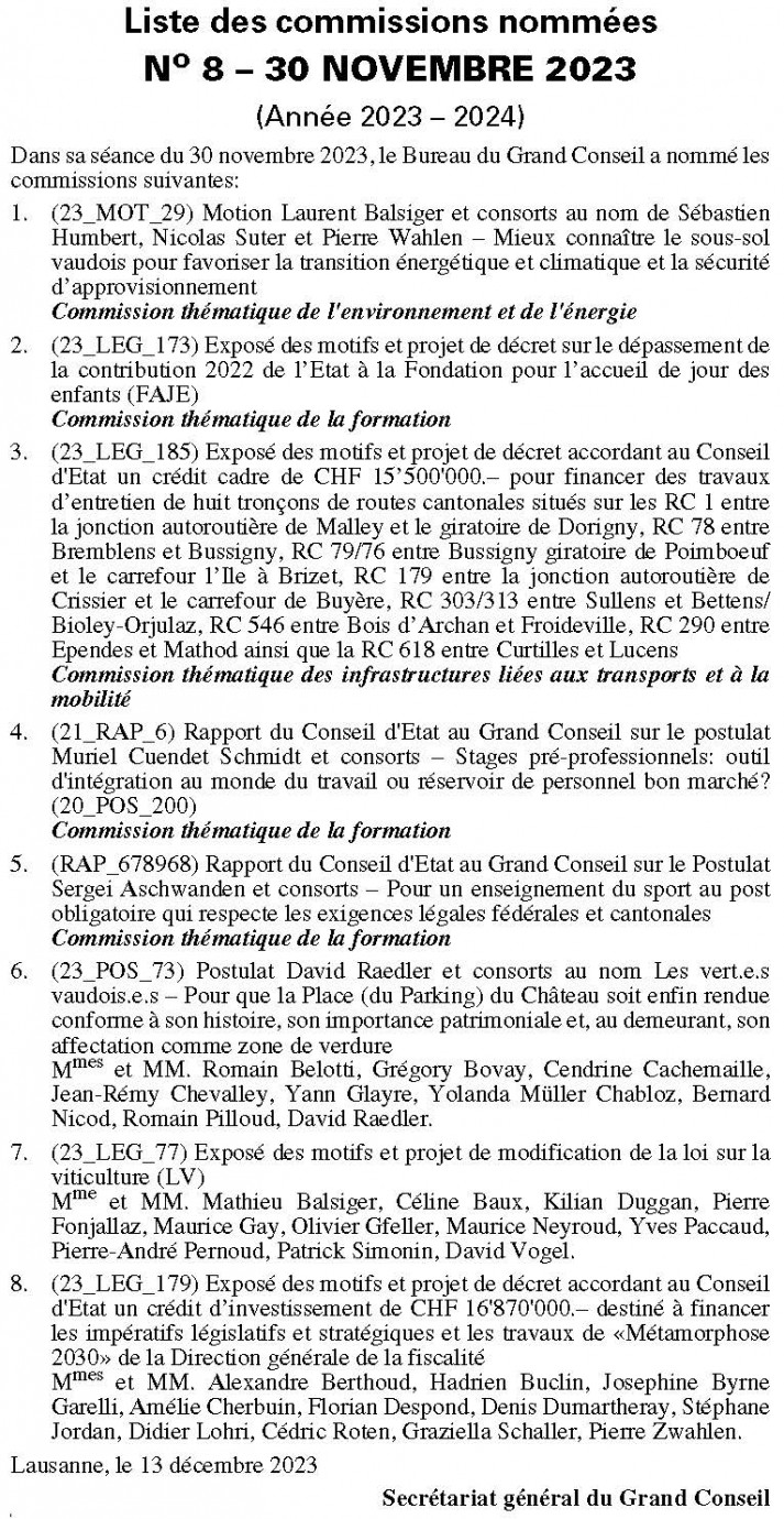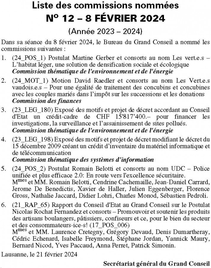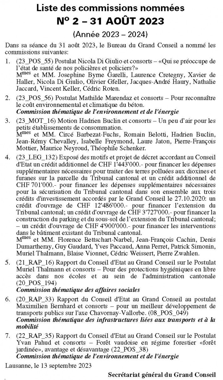 Dans sa séance du 2 novembre 2023, le Bureau du Grand Conseil a nommé les commissions suivantes: