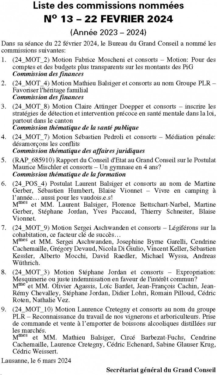 Mme et MM. Mathieu Balsiger, Loïc Bardet, Denis Corboz, Sabine Glauser Krug, Sébastien Humbert, Stéphane Jordan, Marc Morandi, Cédric Roten, Théophile Schenker.