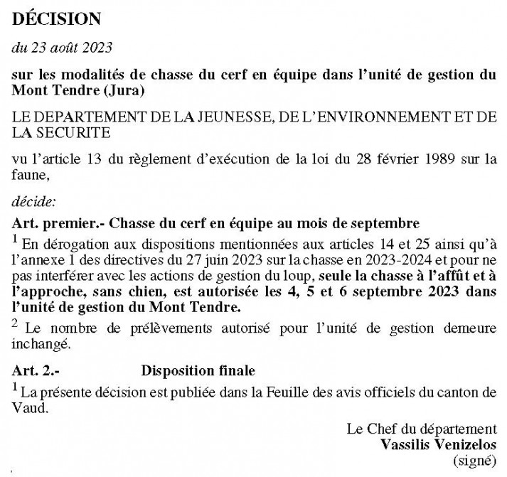 - Charge la Direction générale de l’environnement (DGE), division Biodiversité et paysage, de la mise en œuvre de la présente décision par les surveillants permanents du corps de Police faune-nature, dès sa notification par voie de publication dans la Feuille des avis officiels (FAO) du 1er septembre 2023.