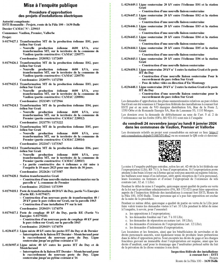 La publication de ce projet électrique est coordonnée avec celle du dossier de demande de permis de construire du parc éolien du Mollendruz.