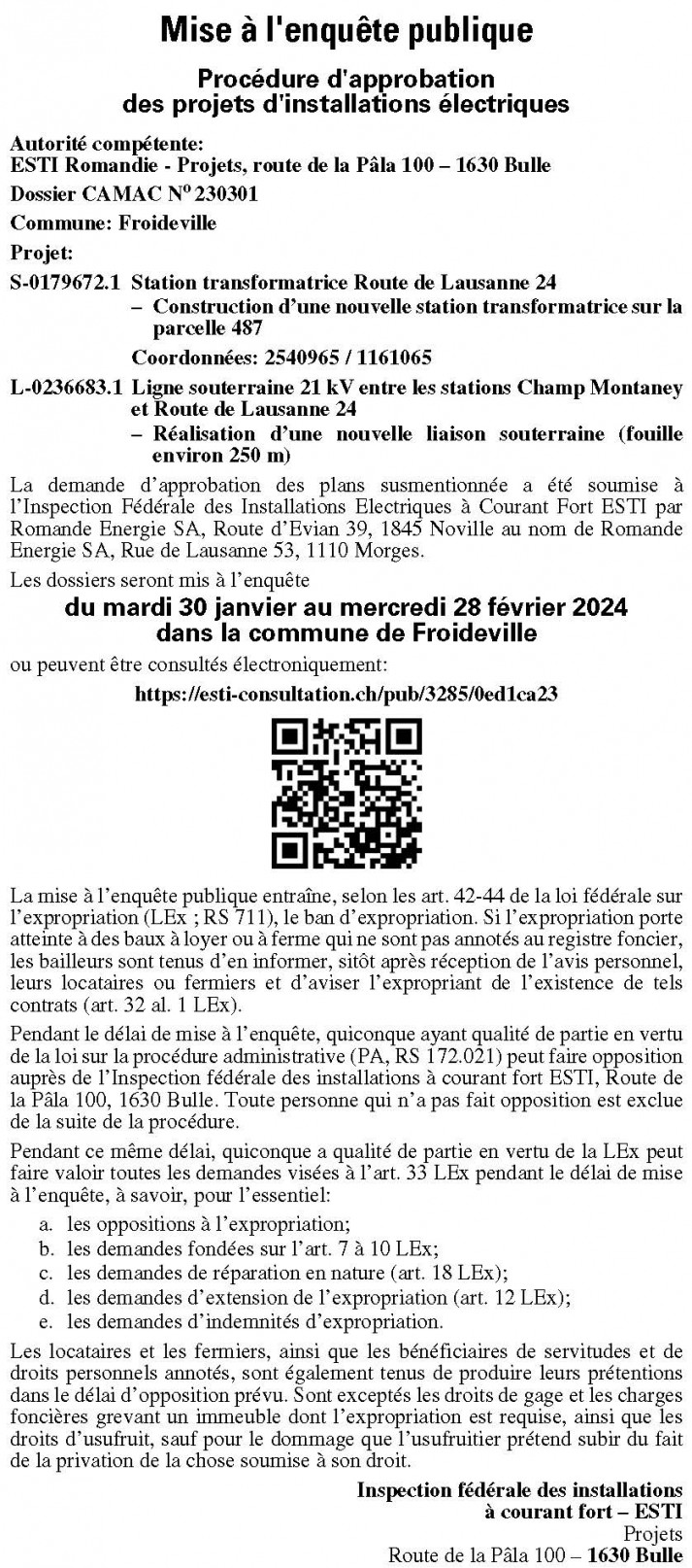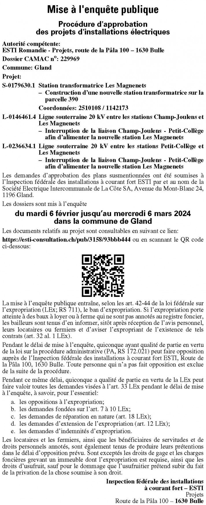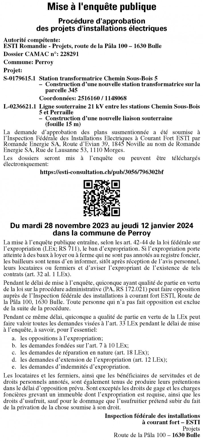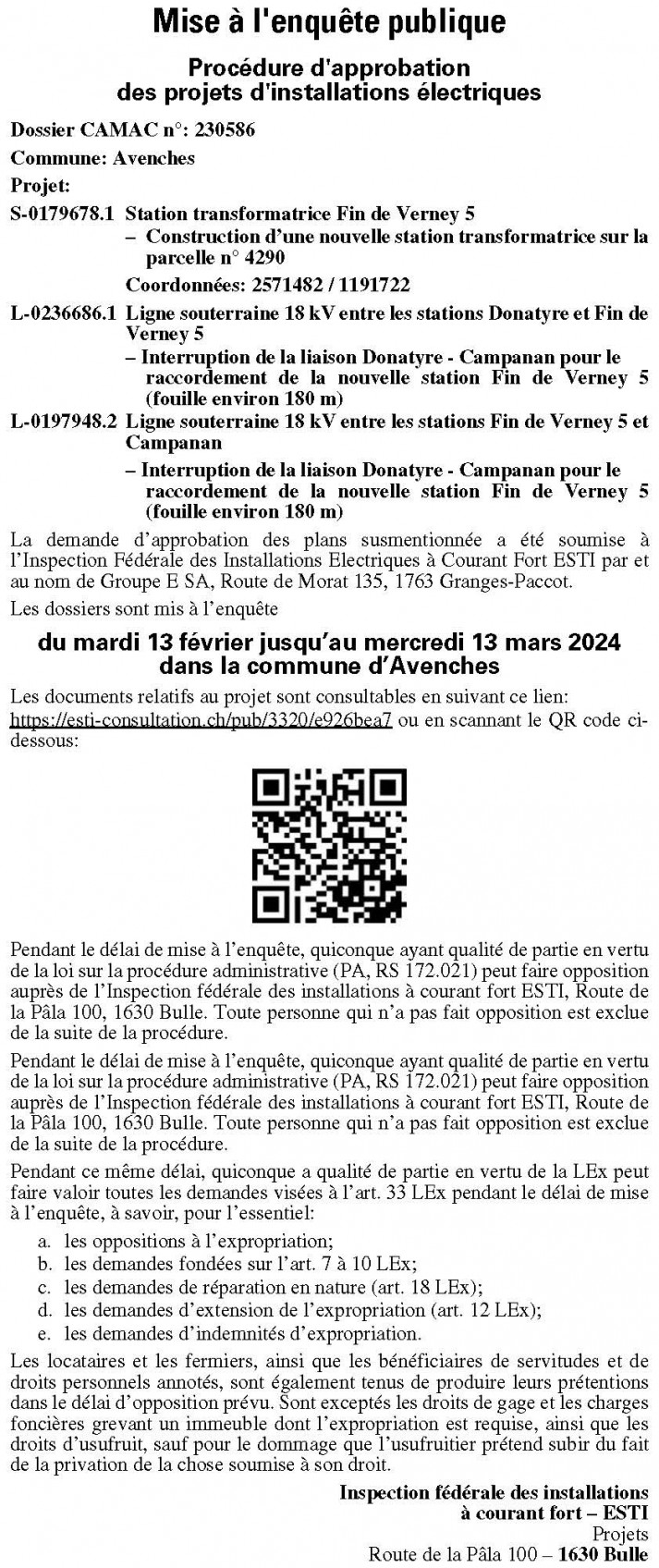 Pendant le délai de mise à l’enquête, quiconque a qualité de partie en vertu de la loi fédérale sur la procédure administrative (PA; RS 172.021) peut faire opposition auprès de l’Inspection fédérale des installations à courant fort ESTI, Route de la Pâla 100, 1630 Bulle. Toute personne qui n’a pas fait opposition est exclue de la suite de la procédure.