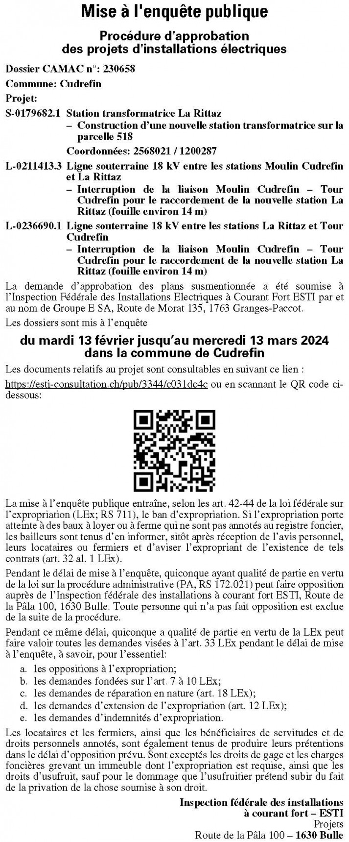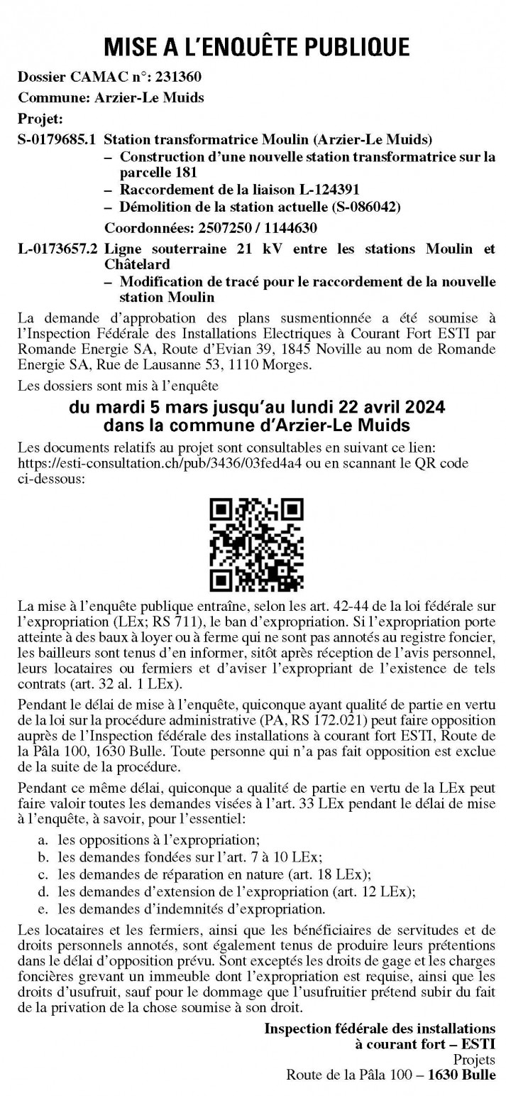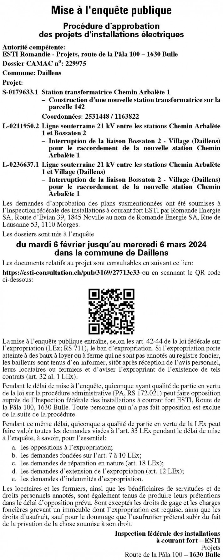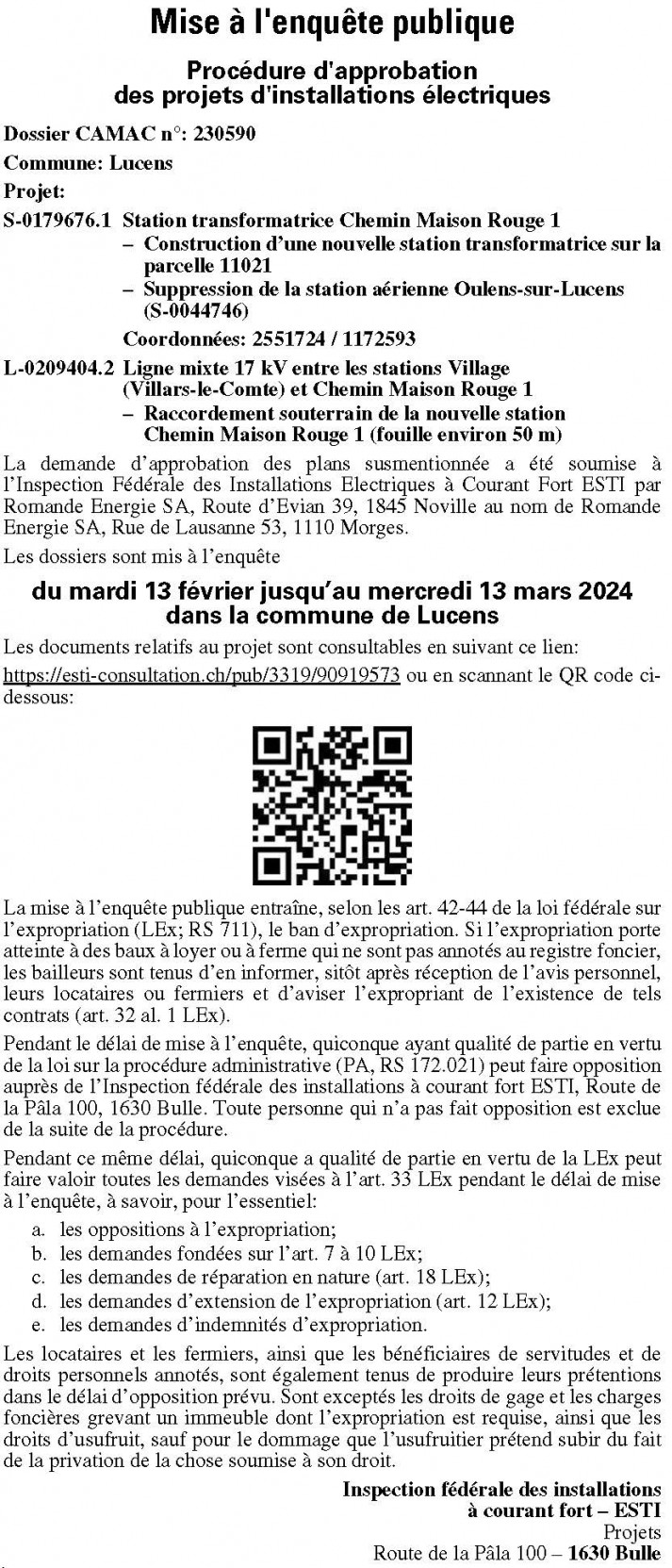 Pendant le délai de mise à l’enquête, quiconque a qualité de partie en vertu de la loi fédérale sur la procédure administrative (PA; RS 172.021) peut faire opposition auprès de l’Inspection fédérale des installations à courant fort ESTI, Route de la Pâla 100, 1630 Bulle. Toute personne qui n’a pas fait opposition est exclue de la suite de la procédure.