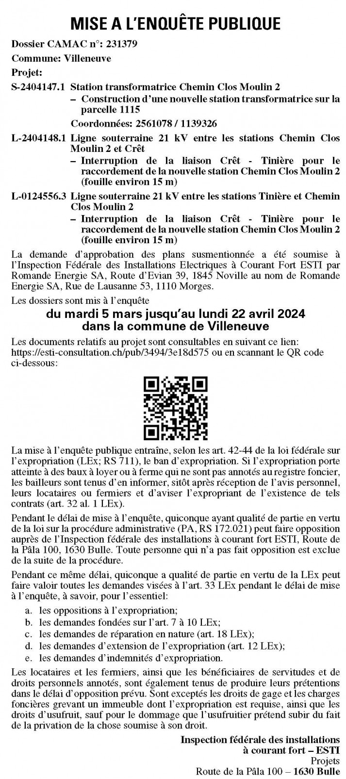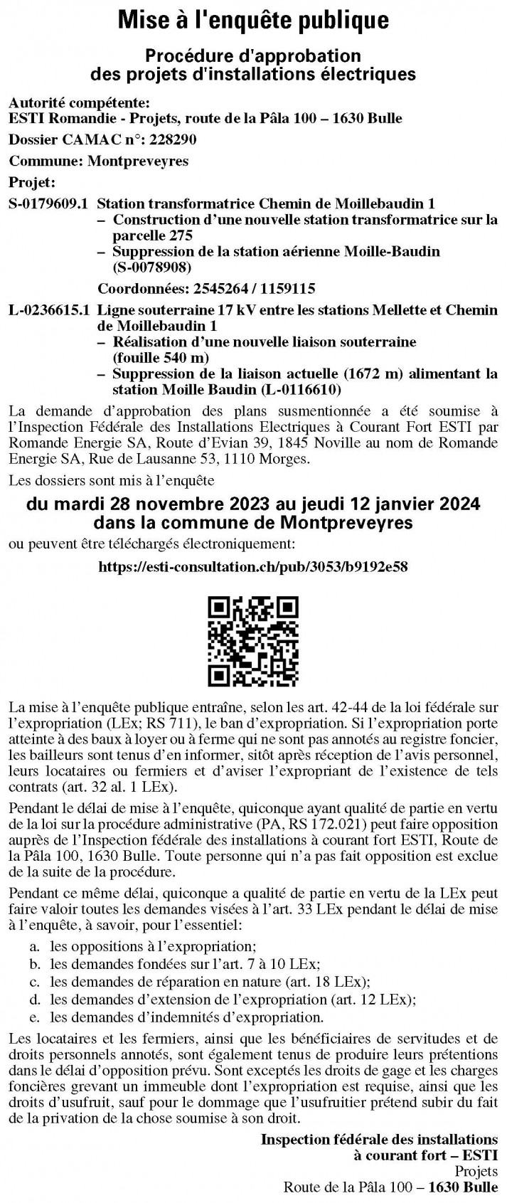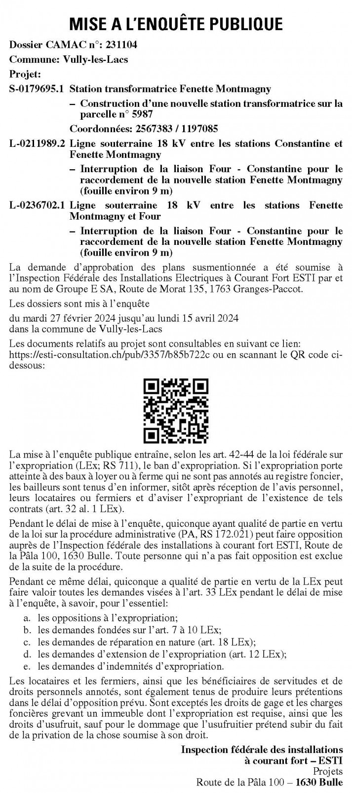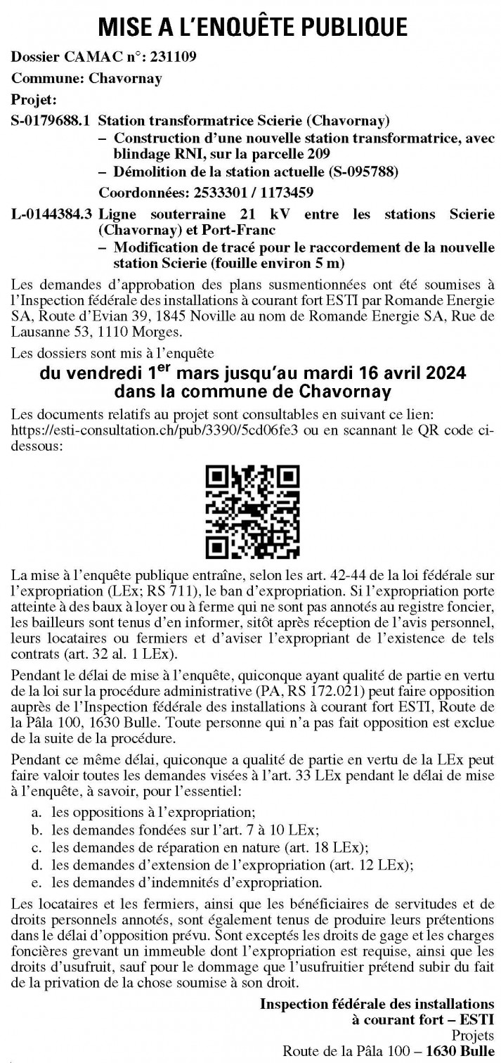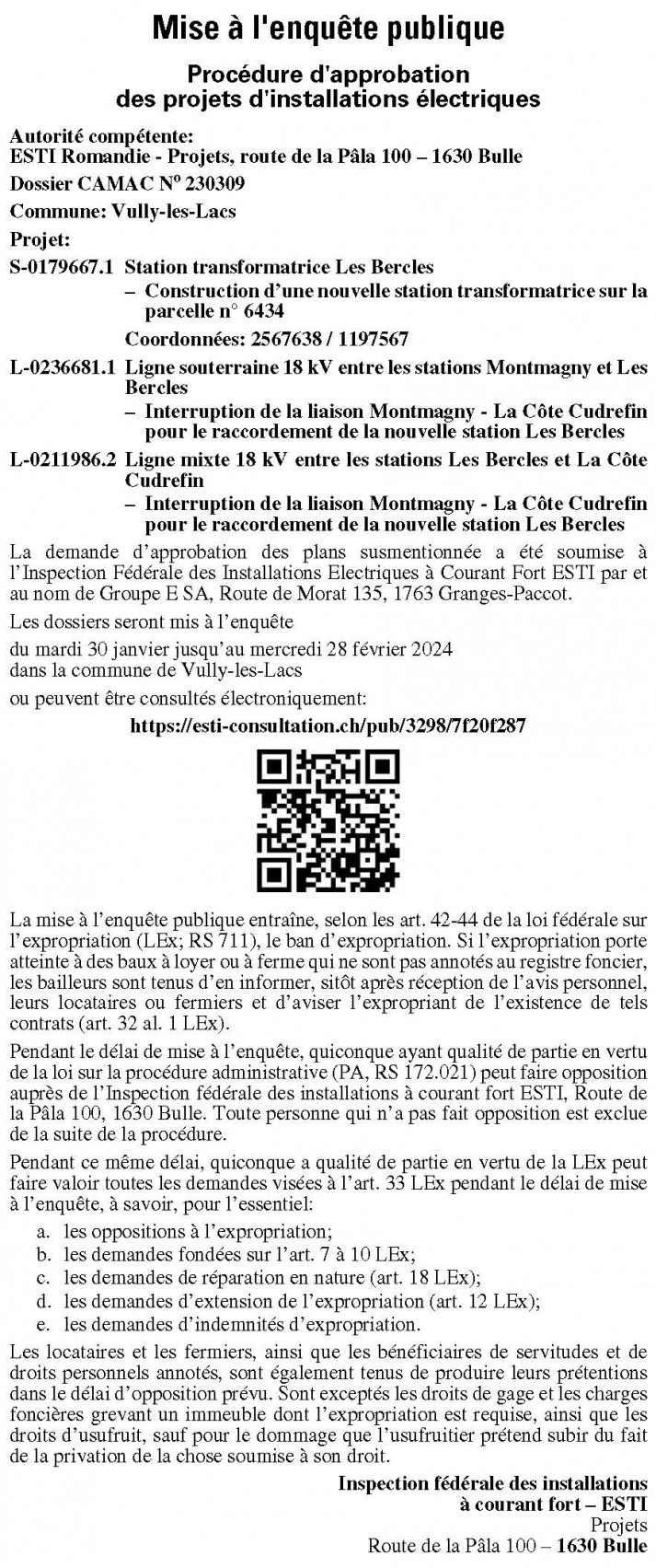 Pendant le délai de mise à l’enquête, quiconque a qualité de partie en vertu de la loi fédérale sur la procédure administrative (PA; RS 172.021) peut faire opposition auprès de l’Inspection fédérale des installations à courant fort ESTI, Route de la Pâla 100, 1630 Bulle. Toute personne qui n’a pas fait opposition est exclue de la suite de la procédure.