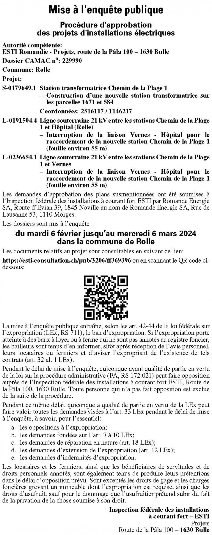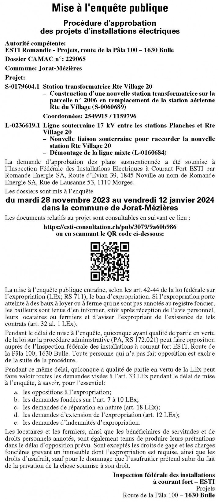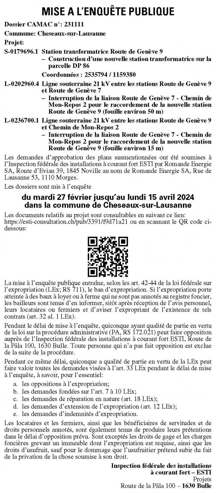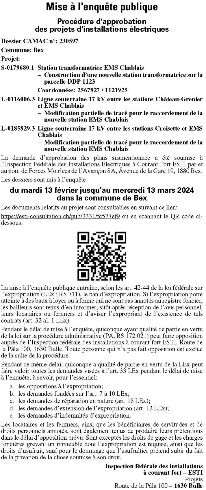 Pendant le délai de mise à l’enquête, quiconque a qualité de partie en vertu de la loi fédérale sur la procédure administrative (PA; RS 172.021) peut faire opposition auprès de l’Inspection fédérale des installations à courant fort ESTI, Route de la Pâla 100, 1630 Bulle. Toute personne qui n’a pas fait opposition est exclue de la suite de la procédure.