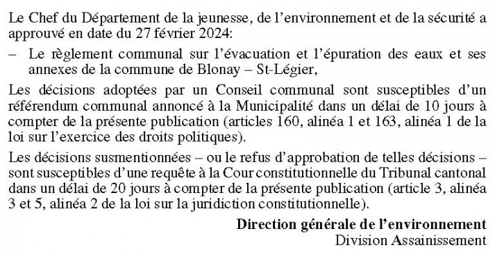 Le 27 juin 2023, le Département de la jeunesse, de l’environnement et de la sécurité a approuvé le règlement communal sur la protection du patrimoine arboré de la commune de Grandson, sous réserve des droits des tiers et à condition que les demandes de dérogation pour la suppression et l’élagage excédant l’entretien courant soient désormais mises à l’enquête publique et publiées dans la FAO, point sur lequel le règlement devra être ajusté dans les meilleurs délais.