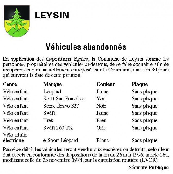En application des dispositions légales en la matière et conformément à l'article 26a de la loi vaudoise sur la circulation routière, un délai de 30 jours est imparti au détenteur du véhicule cité ci-dessous pour en prendre possession au Dépannage Automobile La Côte à Burtigny:24.12.2024 / FAO n° 103