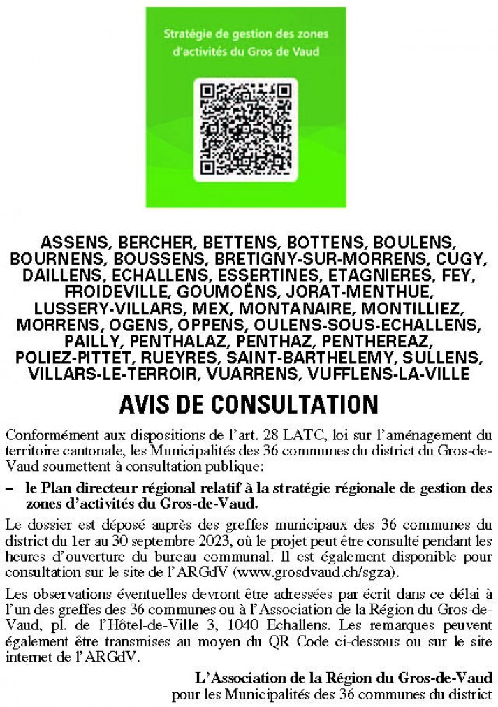 Conformément aux dispositions de la LATC, les Municipalités de Avenches, Bussy-sur-Moudon, Champtauroz, Chavannes-sur-Moudon, Chevroux, Corcelles-le-Jorat, Corcelles-près-Payerne, Cudrefin, Curtilles, Dompierre/VD, Faoug, Grandcour, Henniez, Hermenches, Lovatens, Lucens, Missy, Moudon, Payerne, Prévonloup, Ropraz, Rossenges, Syens, Trey, Treytorrens (Payerne), Valbroye, Villars-le-Comte, Villarzel, Vucherens, Vulliens, Vully-les-Lacs mettent en consultation publique