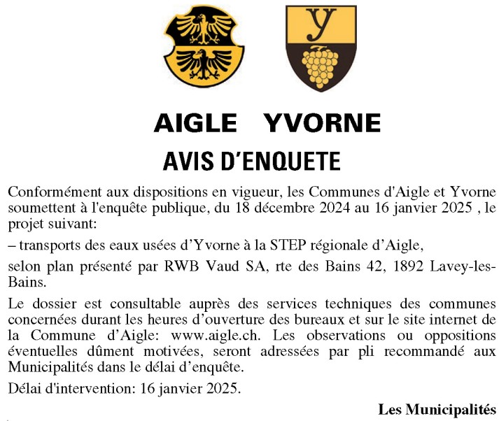 Dans le cadre de la régionalisation de l'épuration des eaux usées vers la nouvelle STEP de l'ASET à Echallens et conformément aux dispositions de la Loi sur la protection des eaux contre la pollution (LPEP), la Municipalité soumet à l'enquête publique du 28 mars au 26 avril 2025: