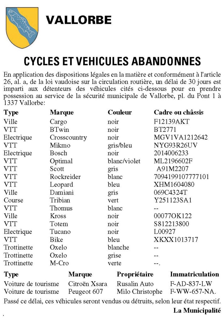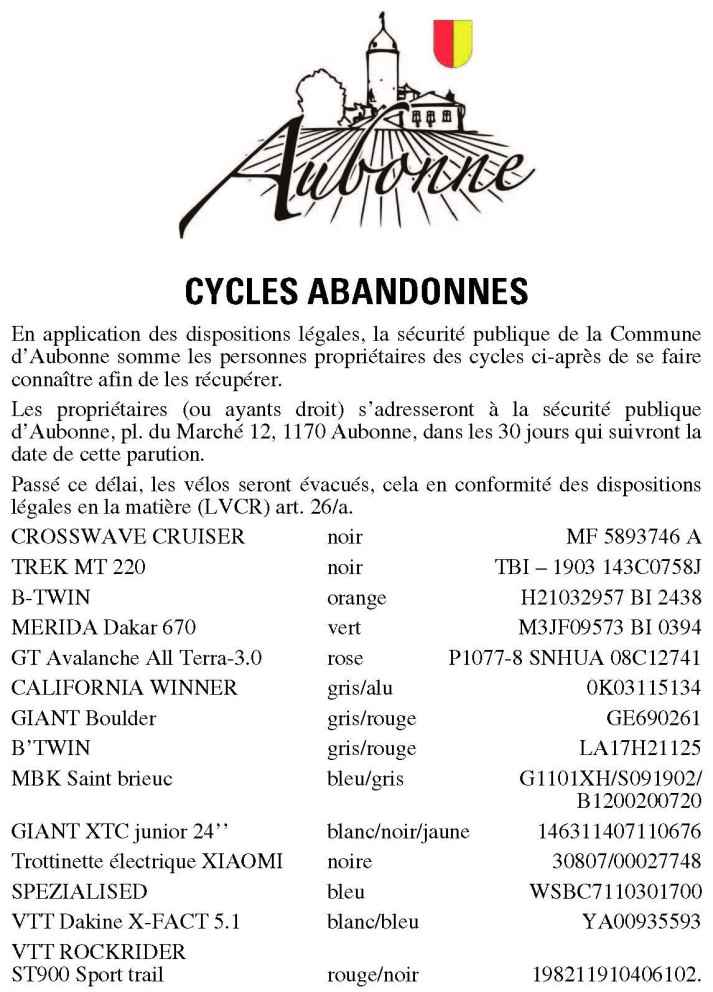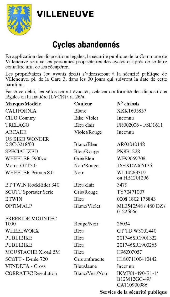 En application des dispositions légales, la Commune de Moudon somme les détenteurs des cycles désignés ci-dessous de récupérer leurs véhicules, actuellement déposés à la fourrière municipale. Ces propriétaires (ou ayants droit) s’adresseront à la réception du service de sécurité publique, pl. de l’Hôtel-de-Ville 1, 1510 Moudon, dans les 30 jours qui suivront la date de cette parution.