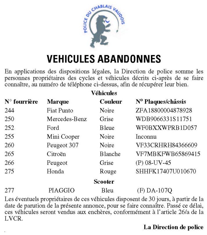 En application des dispositions légales, la police administrative de Grandson somme M. CANTADEIRO SIMOES João Anibal, né le 31 juillet 1974, ressortissant portugais, sans domicile connu, anciennement domicilié à Le Locle, de récupérer son véhicule, actuellement en fourrière communale.