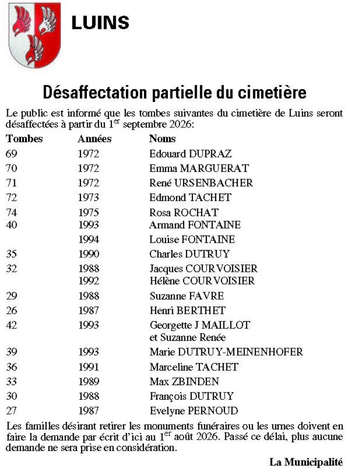 Conformément aux dispositions des articles 70 et suivants du Règlement cantonal sur les décès, les sépultures et les pompes funèbres (RDSPF) du 12 septembre 2012, le public est informé que les tombes suivantes du cimetière de Fossabot à Gland seront désaffectées <span class="b"> à partir du 1er septembre 2026.</span>